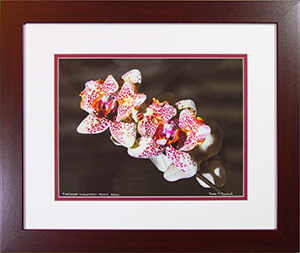 Phalaenopsis Center Stage ‘Pine Ridge Cockleshell’ AM/AOS was produced by Terry Glancy, who owns Pine Ridge Orchids in Homestead, Florida. We met him on a field trip to his home with the Dade Chapter of the Florida Native Plant Society. Besides his home and nursery, the property includes 15 acres of Pine Rockland, for which he and his wife, Barbara, began the difficult restoration process shortly after purchasing in 1978. Very impressive. After the field trip we found this orchid in the nursery.